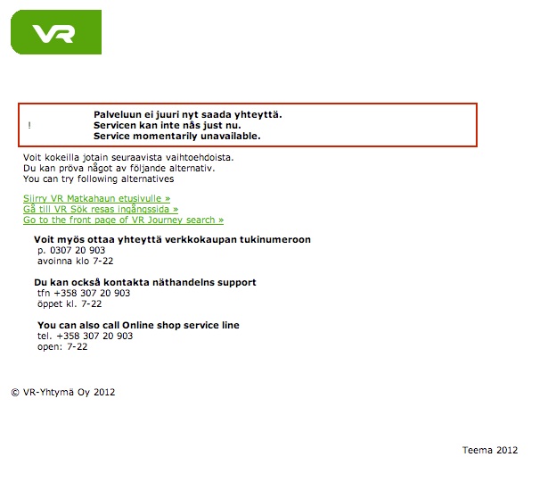 Kirjoitin kauan sitten tavasta, jolla VR tapasi sulkea verkkokauppansa yöksi. Se suljetaan edelleen, mutta nyt siitä ilmoitetaan viisaammin jo ennakkoon. Varoitus näkyy kuvakaappausten keltaisissa laatikoissa.