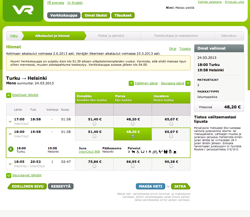 Valitsemalla paikat käsin sain kuin sainkin varattua vierekkäiset paikat erillisille varauksilleni. Maksuvaiheeseen siirryttäni tapahtui jotain evästetaikuttaa ja yhtäkkiä molemmat liput olivatkin yhdessä ja samassa ostoskorissa. Sain lopulta liput hankittua ja alennukset hyödynnettyä, mutta heikompaa olisi voinut hirvittää matkan varrella. Oli onni onnettomuudessa, että ensimmäisellä kerralla en huomannut lainkaan matkustajavalintaa. Muuten aikuisen edullisempi ennakkolippu olisi mennyt minulta kokonaan ohi. Todellisella reitilläni säästö oli vielä jokusen euron parempi.