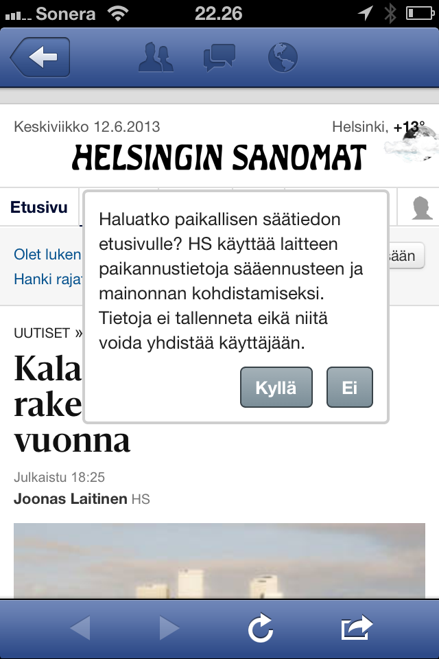 HS tuntuu kysyvän jatkuvasti, haluanko paikantaa itseni, jotta saisin näkyviin säätietoja. En halua. Tavallisesti en halua paikantaa itseäni siksi, että tulin lukemaan uutista enkä katsomaan säätä. Säätietoja katsoessani en yleensä halua paikantaa itseäni, sillä olen Helsingissä ja sivut näyttävät muutenkin oletuksena Helsingin sään. Mistä tämän saa kytkeä pois?