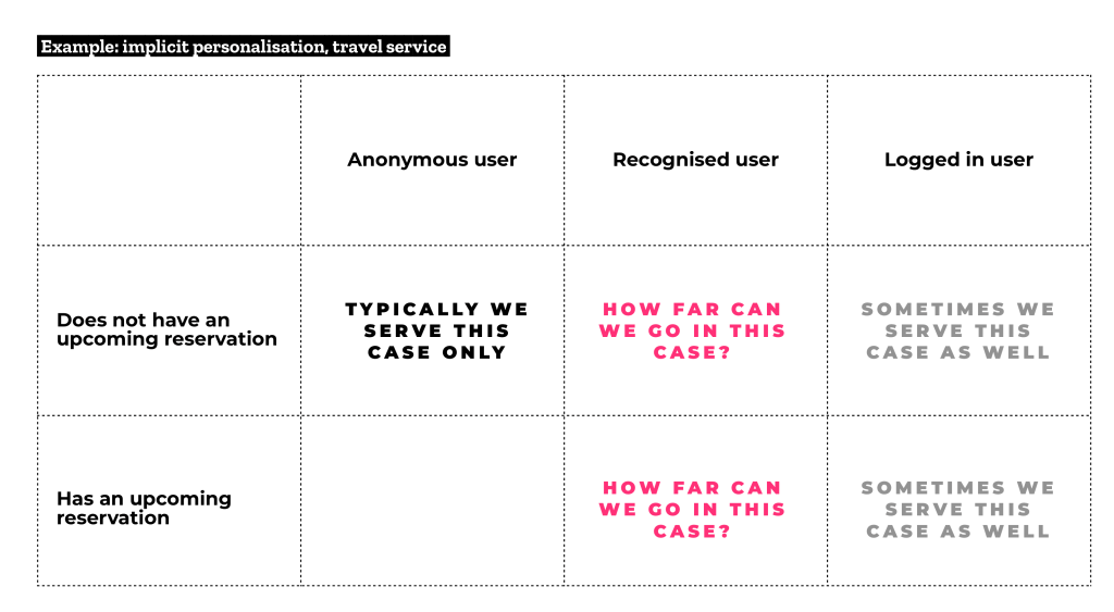 Matkailuala tarjoaa esimerkin. Todella monen palvelun etusivu näyttää aina samalta. Se on suunnattu tuntemattomalle asiakkaalle, jolla ei ole matkaa varattuna. Joskus saatetaan olla fiksuja ja muokata etusivu erilaiseksi kirjautuneelle käyttäjälle, jolla joko on tai ei ole varattua matkaa.