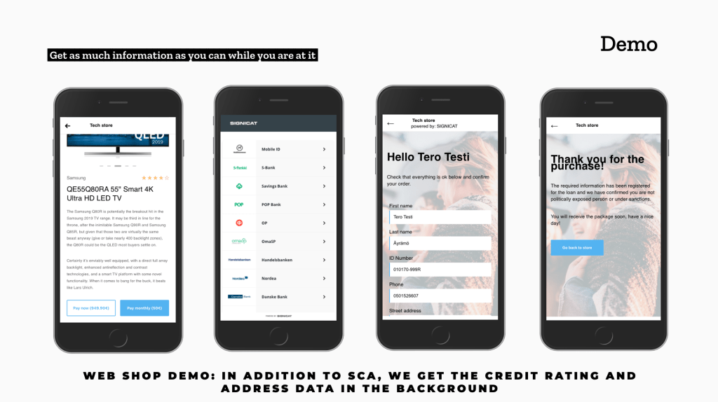 Vastaavasti esimerkkinä lisätiedon haalimisesta samalla vaivalla, kun käyttäjä kuitenkin tunnistetaan vahvasti, yksi esimerkki voisi olla oheinen kuvitteellinen verkkokauppaesimerkki. Käyttäjä tunnistautuu vahvasti osamaksua varten ja samalla taustalla tehdään luottotietotarkistus selvitetään toimitusosoite.
