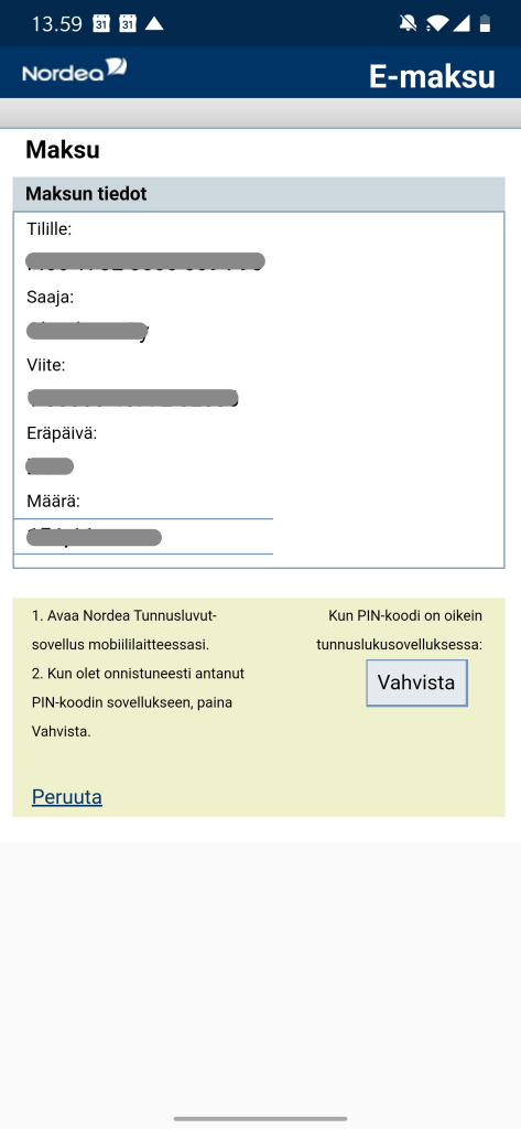 Näiden ruutujen lisäksi välissä käydään kaksi kertaa Nordean koodisovelluksessa kirjoittamassa koodi ja välissä vaihdetaan sovellusta käsin edestakaisin
