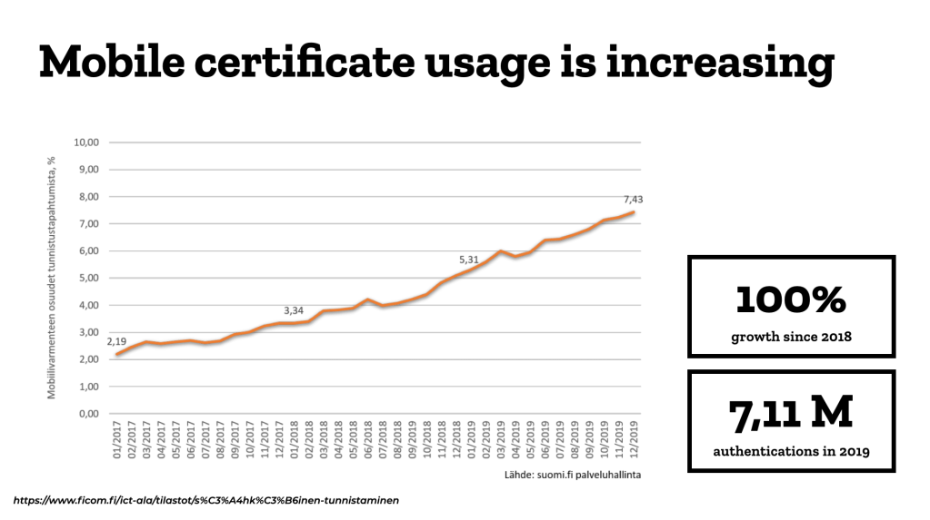Ficomin tilastojen mukaan mobiilivarmenteen käyttö kaksinkertaistui viime vuoden aikana, ja tunnistustapahtumia oli yli 7 miljoonaa kappaletta. Tarkkoja käyttäjämääriä ei ole julkistettu, mutta voidaan olettaa puhuttavan sadoista tuhansista käyttäjistä.