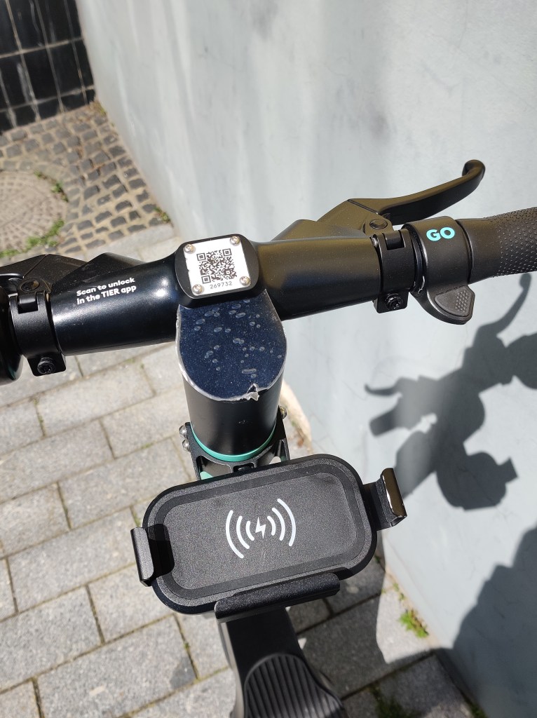 Tierissä on myös suurempi eturengas, joka tekee kulusta miellyttävämpää kaupungin kivikaduilla. Lisäksi Tierissä on teline kännykälle, symbolista päätellen kaiketi sähköistetty. Oma puhelimeni ei ymmärrä langattoman latauksen päälle, joten en päässyt testaamaan. Latausalusta on sikäli hyvä idea, että on kiusallista, jos puhelimesta sattuu loppumaan virta kesken ajon, sillä ajoa ei voi päättää ilman puhelinta.