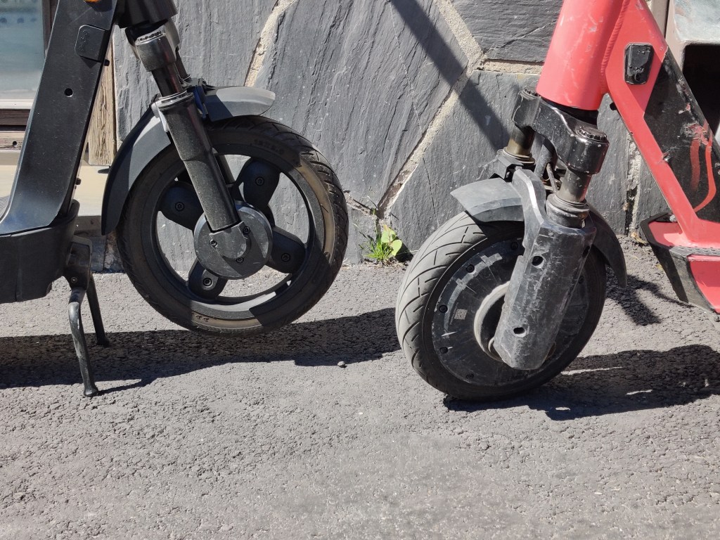 Molemmat palvelut ovat suurentaneet eturenkaan kokoa. Vasemmalla oleva Tier vielä enemmän. Tässä lajissa suurempi on parempi: vähemmän tärinää kivikaduilla ja helpompi ylittää raitiovaunukiskoja. Toisaalta, mitä korkeammalla lauta on, sitä vaikeampi ylämäessä on potkiä vauhtia. Äh, kompromisseja.