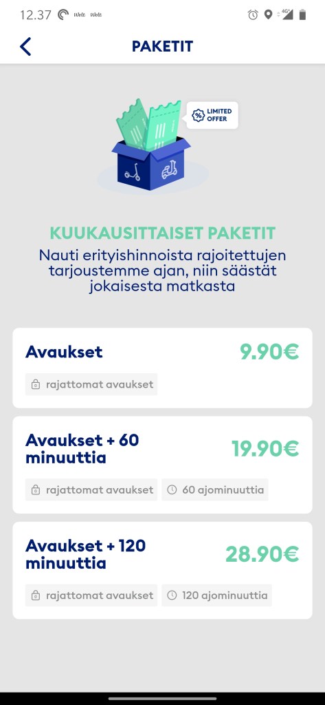 Tier kokeilee myös uutta hinnoittelua. Maksamalla kympin kuussa saa ilmaiset avaukset, eli tuo muuttuu kannattavaksi kymmenellä käyttökerralla [oho, osaat matematiikkaakin!]. Maksamalla 28,90 € kuussa, saa lisäksi 120 ilmaisminuuttia, eli tuolla paketilla minuuttihinta putoaa lähelle viime kesän perushintaa. Jotenkin tämä konkretisoi, miten merkittävästä hinnankorotuksesta on kyse.