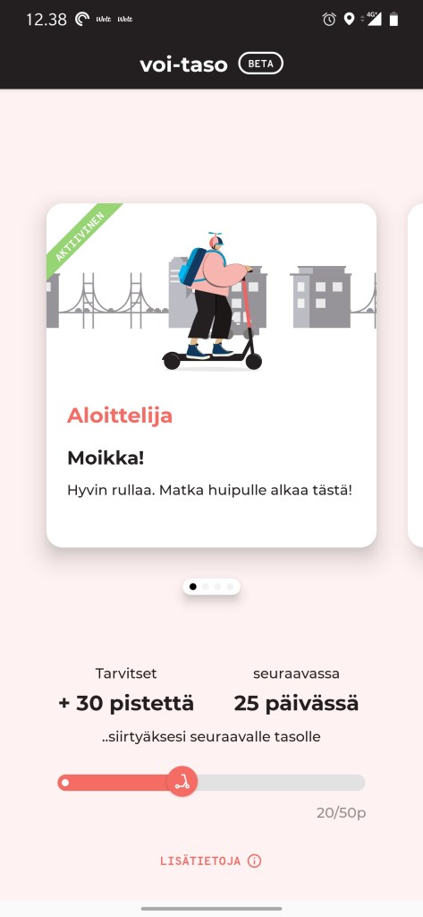 Tällä viikolla ominaisuus palasi näkyviin. Homma toimii siten, että jokaisesta ajosta saa kymmenen pistettä ja kerättyään 50 pistettä kuukaudessa nousee seuraavalle tasolle. Taso tasolta avausmaksut putoavat: ensin neljänneksen, sitten puolet, lopulta poistuvat kokonaan. Tämä ohjaa kevyesti keskittämään lautailun Voin laitteisiin, mutta paljon ajava saa paremman kokonaisdiilin Tieriltä.