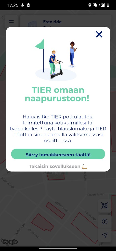 Tier-sovelluksessa eteeni pomppasi yllättäen lomake, jolla sai toivoa ajastettua laitetäydennystä vaikka kotiovelleen. Kyselylomake näkyy olevan käytössä vain toukokuun loppuun.