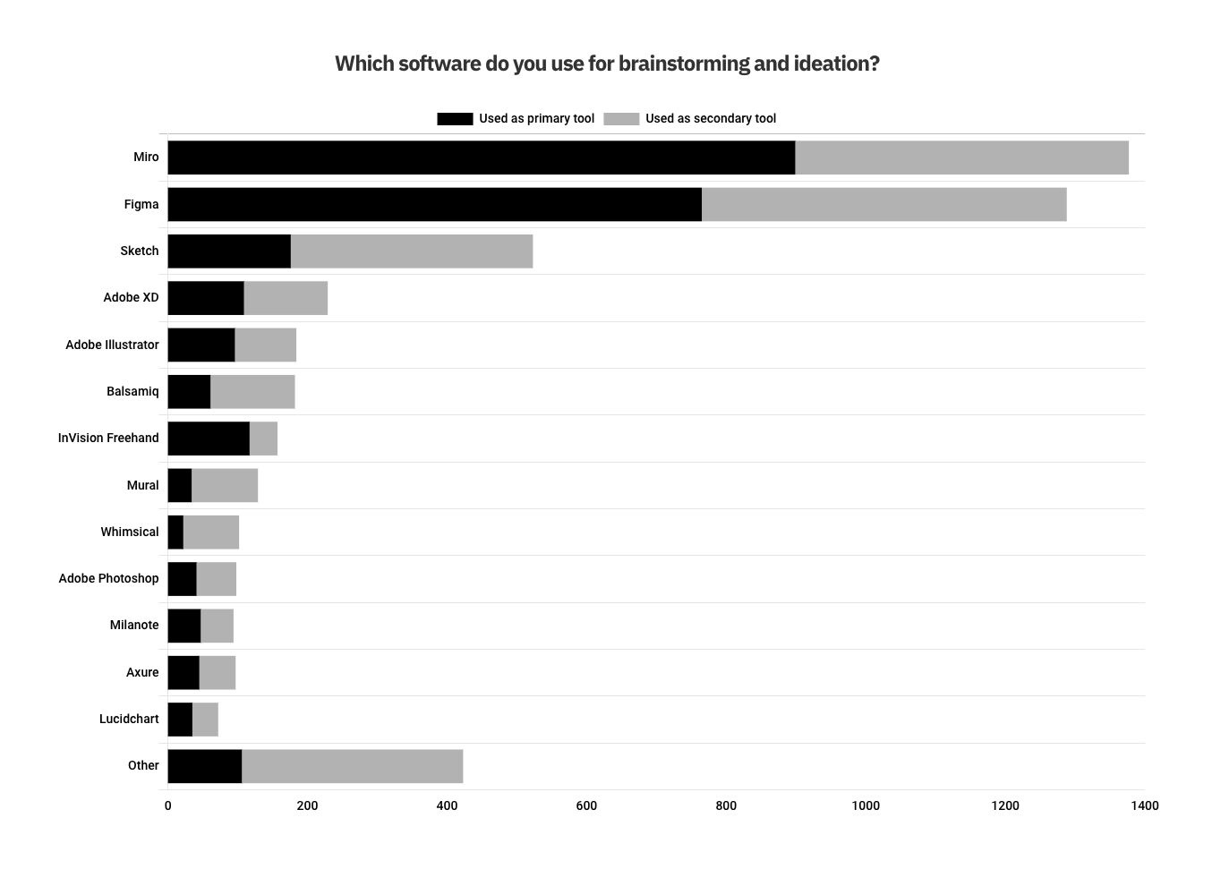 Original post. Good insight about the state of the tools for design, facilitation, user research, design systems etc (n > 4000). I was not surprised to see Figma dominating. I was a bit surprised, though, to see that Sketch is still so much bigger than Adobe XD and that Miro beats Mural with such a margin.