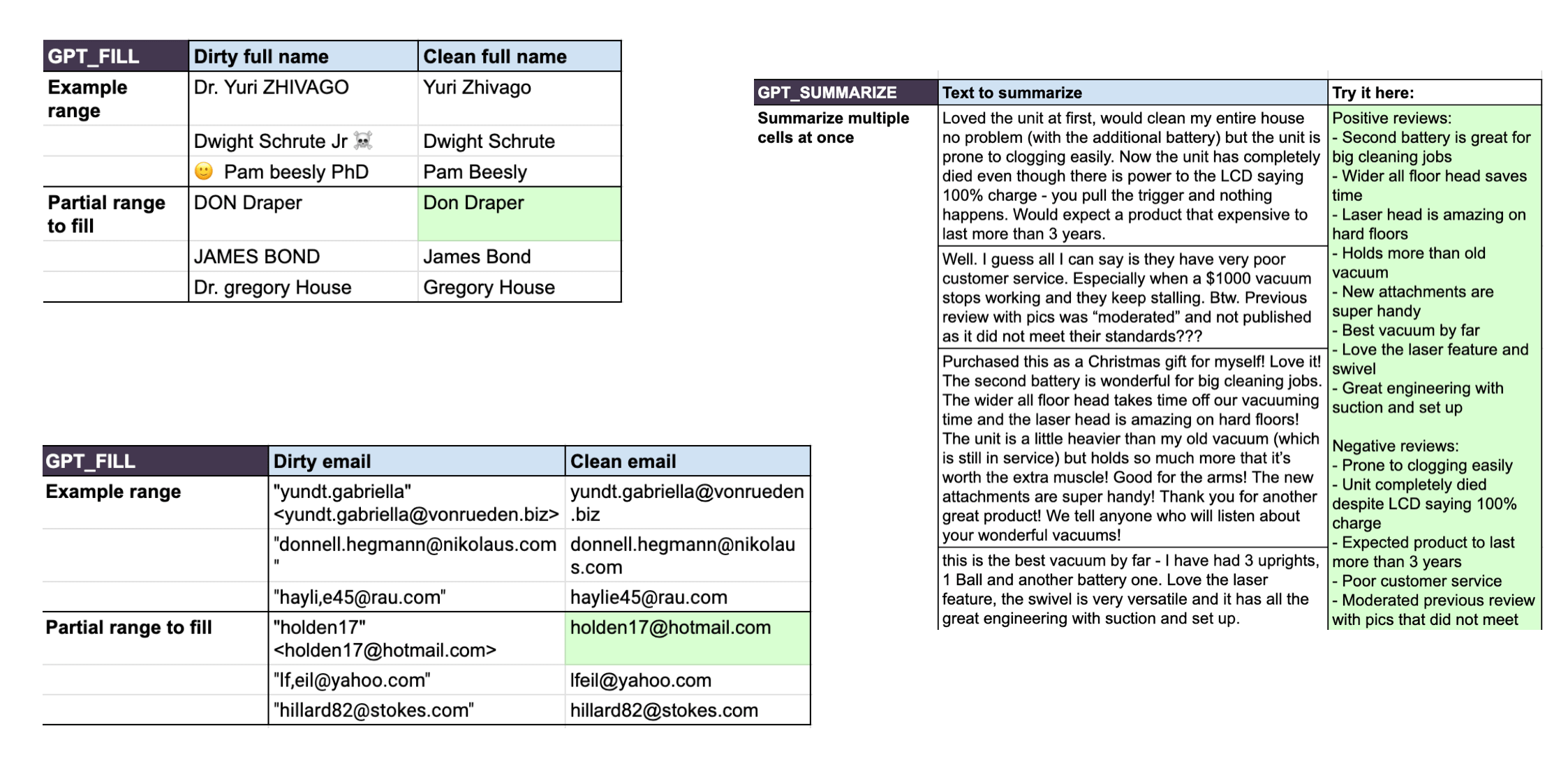 GPT for Work -esimerkkejä. Epämääräisesti kirjoitettujen nimien vakioimista, rikkinäisten sähköpostiosoitteiden korjaamista, tekstin tiimistämistä pyydetyn formaatin mukaisesti.