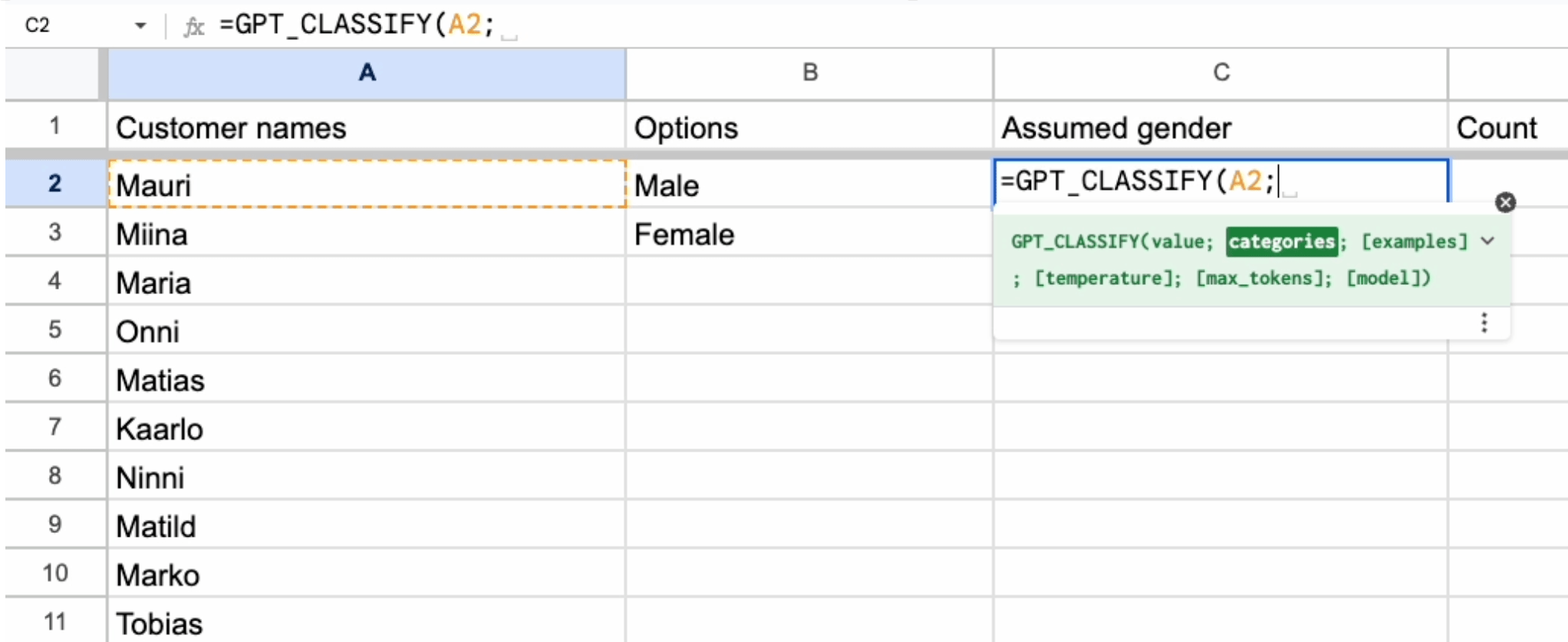 Kun GPT for Work -laajennus on lisätty Google Sheetsiin, käyttöön saa tukun GPT-alkuisia komentoja. GPT_CLASSIFY-komennolle annetaan syötteeksi kategorisoitava asia ja kategoriat. Lisäksi voidaan antaa esimerkkejä lisäohjeeksi, mutta suomalaiset nimet onnistuivat ihan lonkalta.