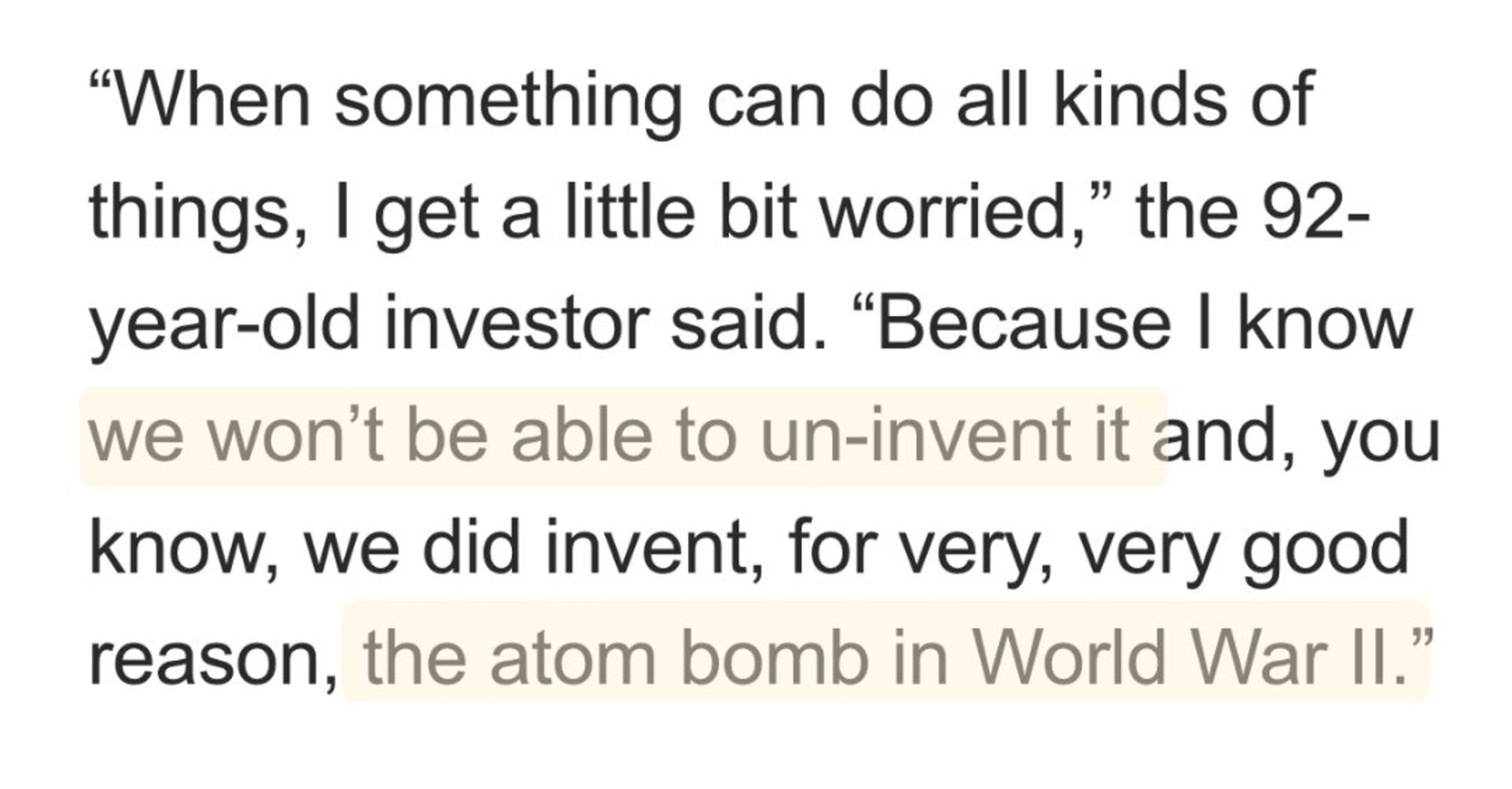 Buffet ei ole välttämättä merkittävin auktoriteetti arvioimaan tietyn teknologian vaikutuksia, mutta on osuva huomio, että kerran keksitty teknologia on aina läsnä, vaikka päättäisimme olla käyttämättä sitä.
