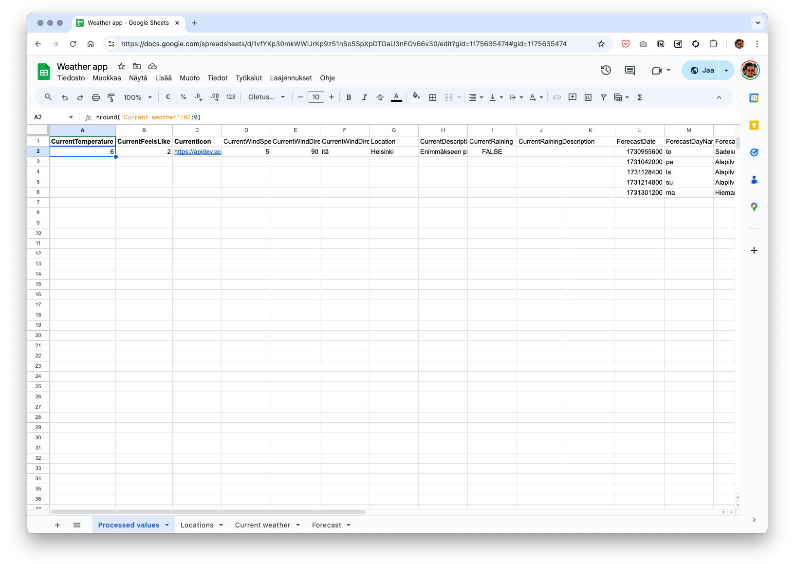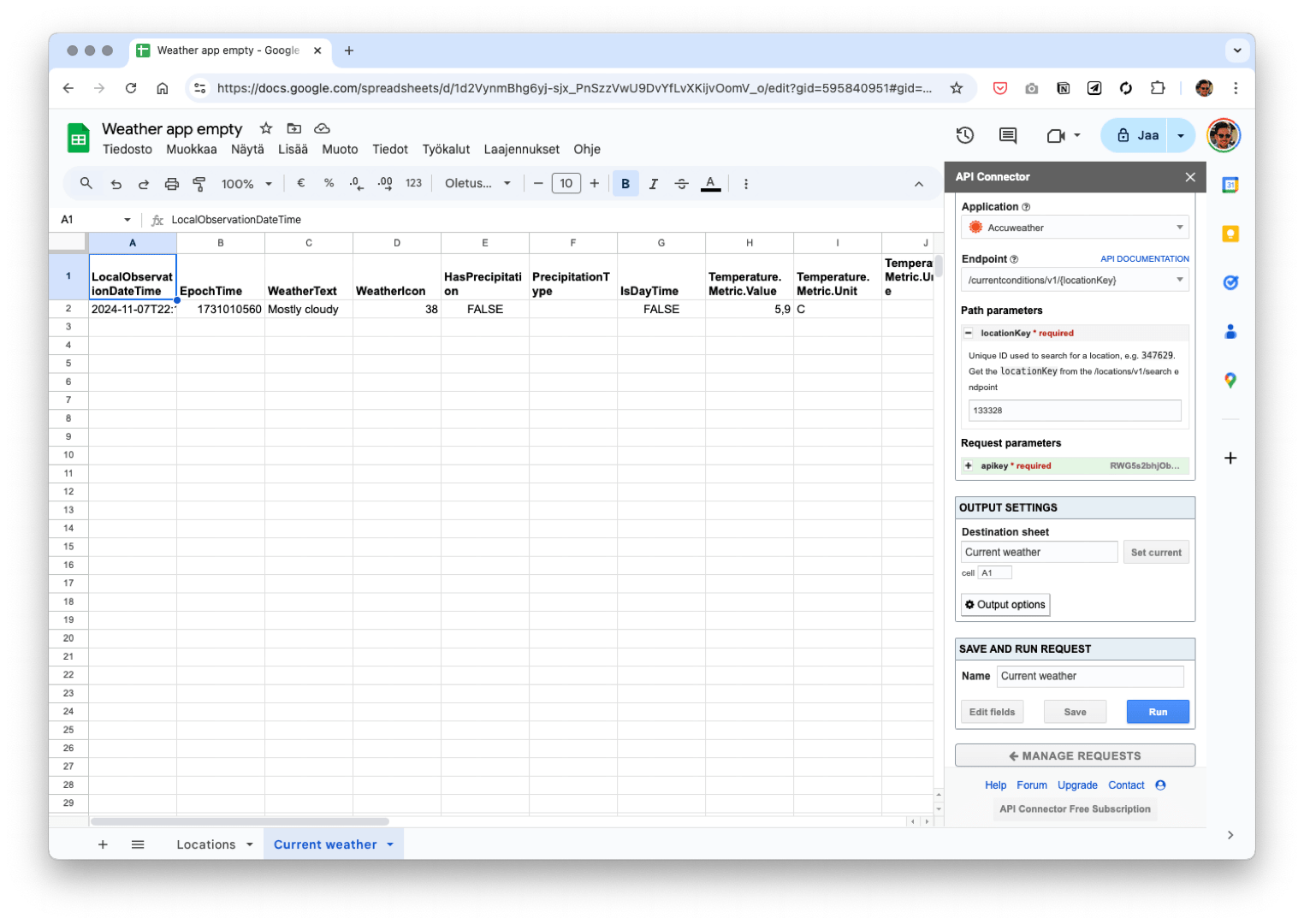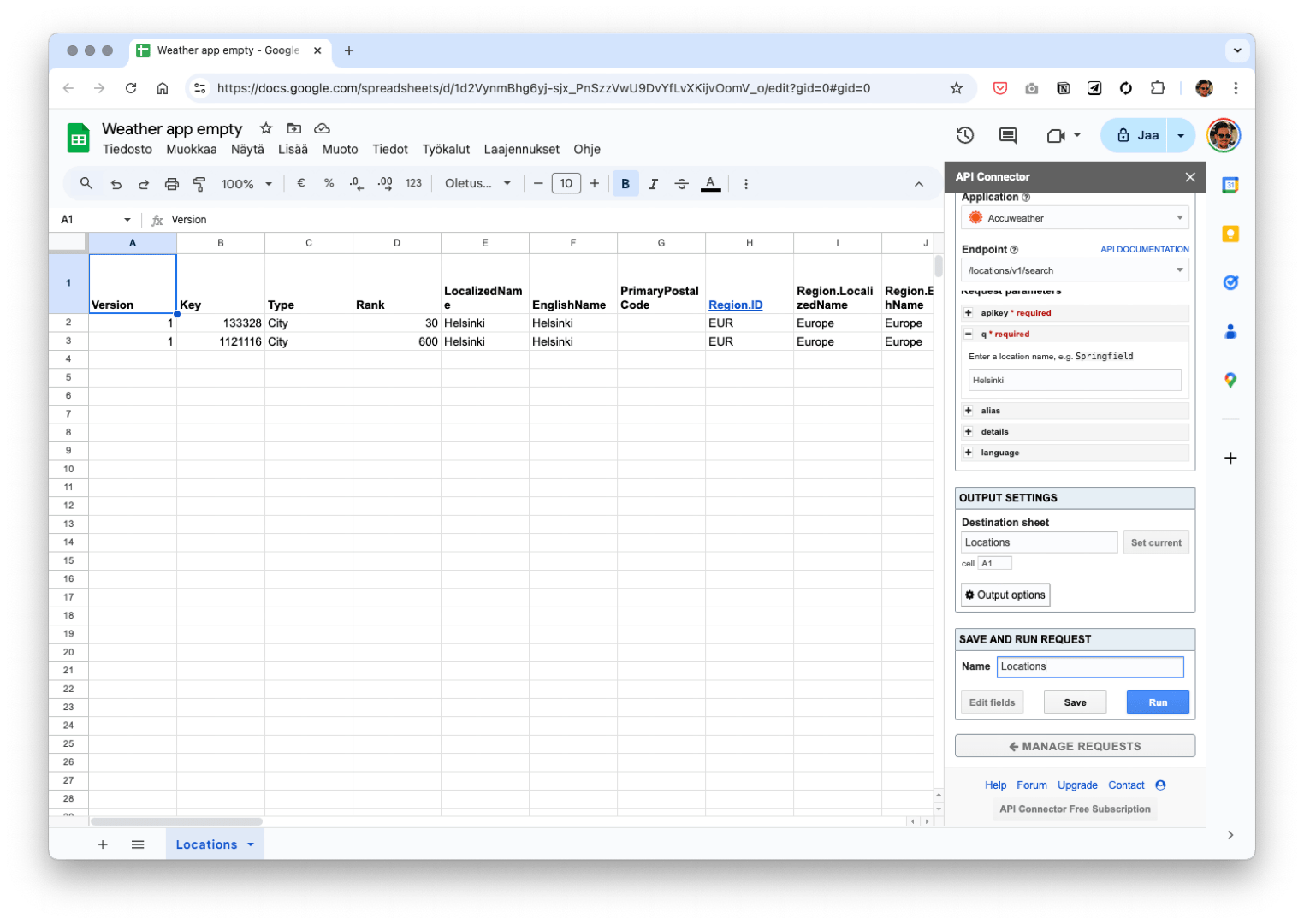 We see that we got two different results for Helsinki. Scrolling the table sideways you see that they are from different locations. Either one is close enough for our purposes. We use the first result and you can find the locationKey in the cell B2.