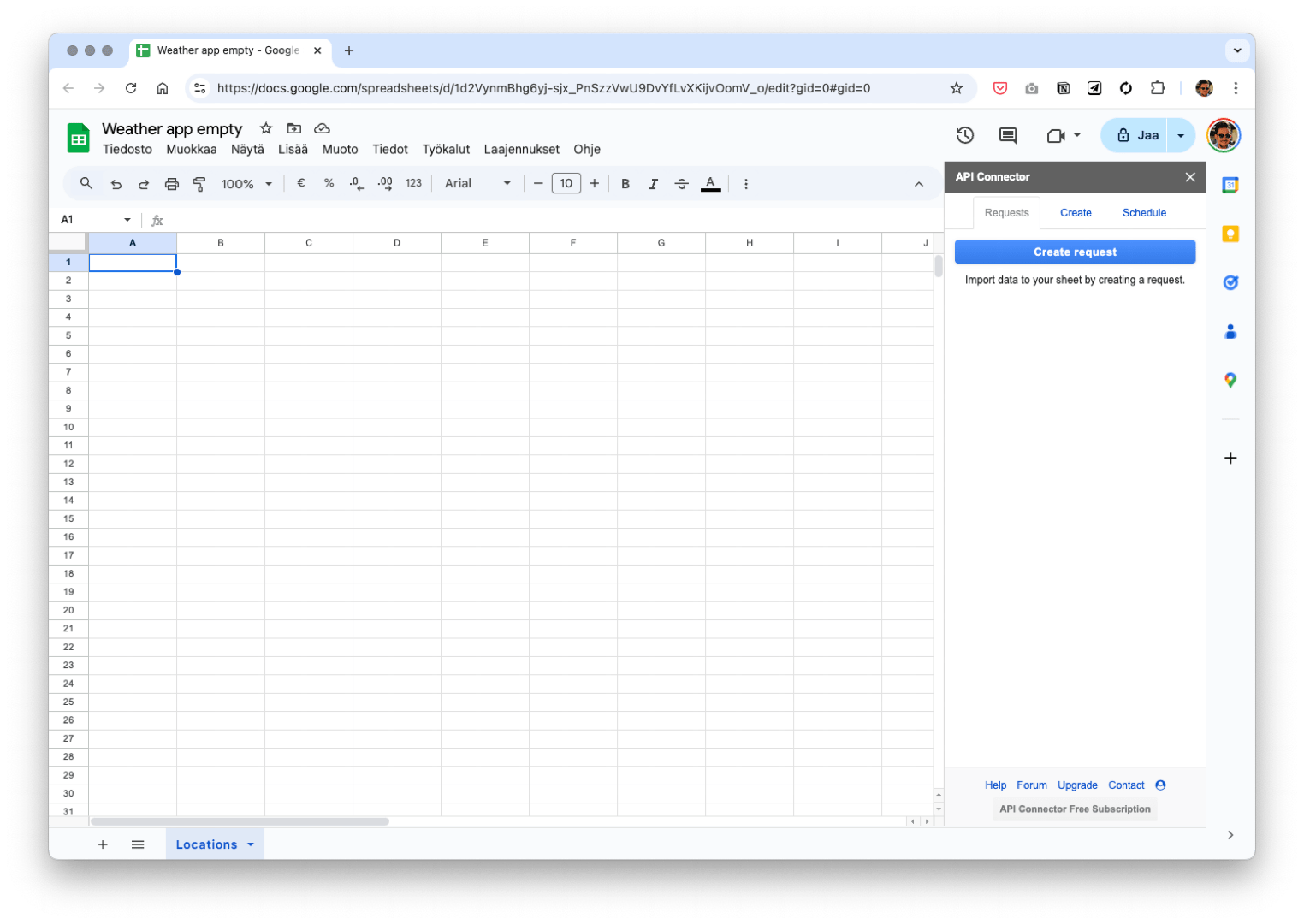 You still need to define where you want to store the data that will be fetched. Click the cell A1 in the sheet Locations and press the Set current button. It’s generally a good idea to fill the sheet starting from A1.