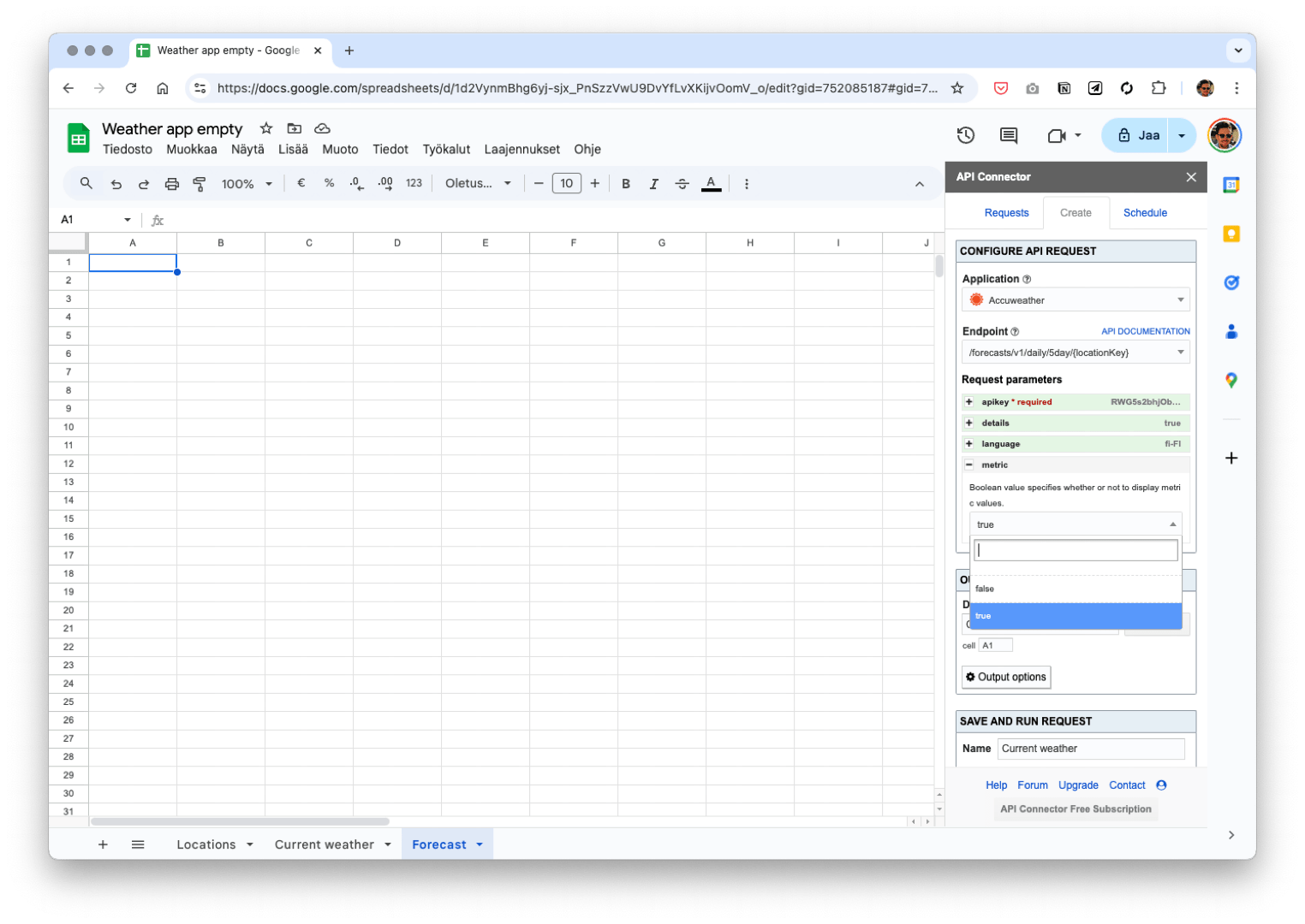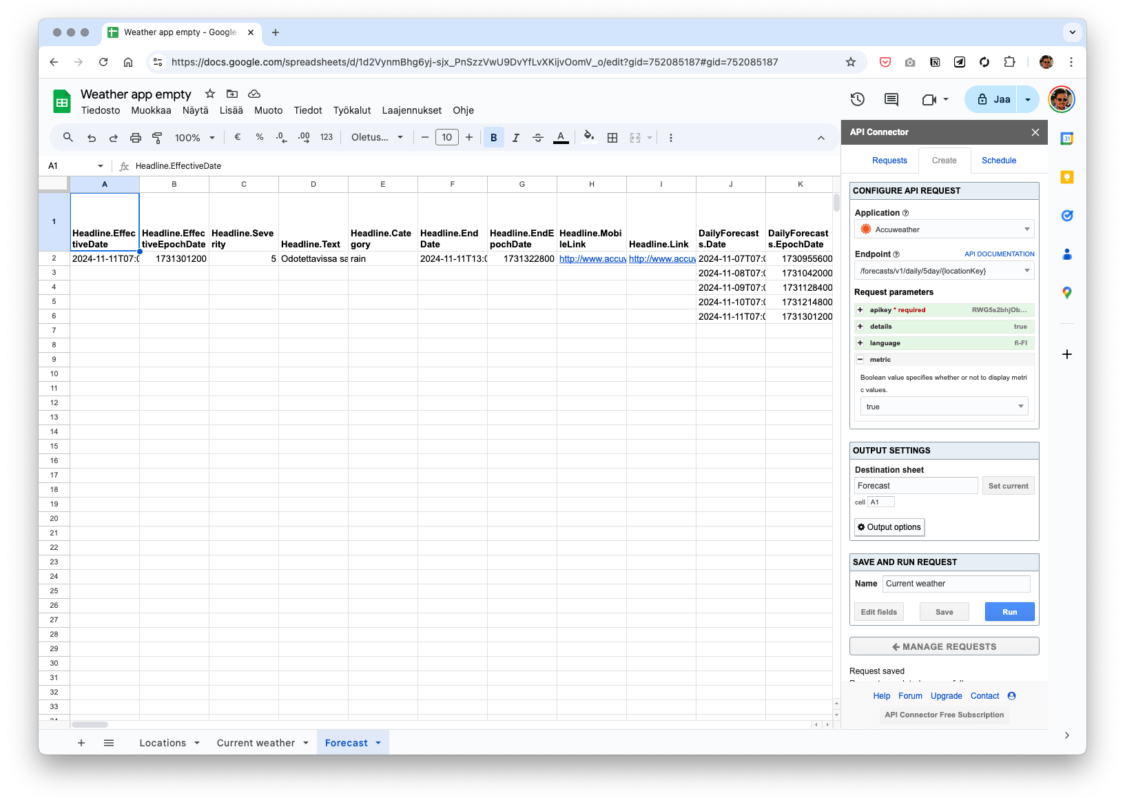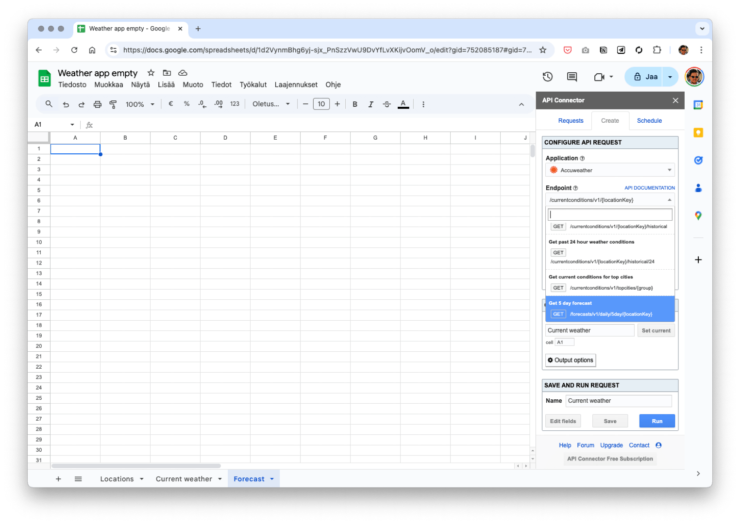 Now that we have successfully fetched the data for the current weather, let’s repeat the process for the weather forecast. Create a new sheet and name it Forecast. Duplicate your previous request and start editing it. Choose the endpoint Get 5 day forecast.