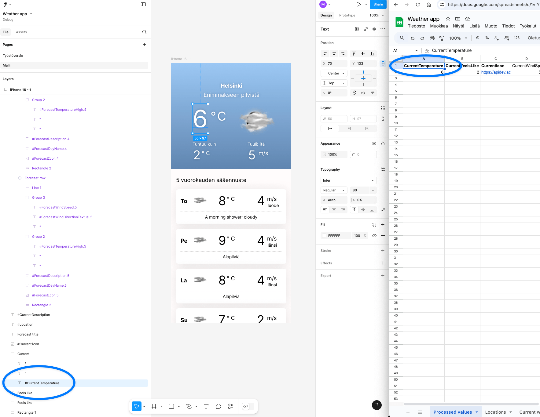 To attach values in the Figma file to the values in the Google Sheet, let’s use a simple syntax. Name the layer with the same name you use as the title for the Google Sheets column and add a # before the name. So, what is CurrentTemperature in Google Sheets becomes #CurrentTemperature in Figma. It’s as simple as that.