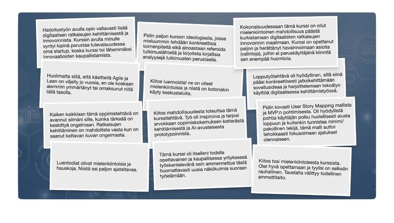 “Harjoitustyön avulla opin valtavasti lisää digitaalisten ratkaisujen kehittämisestä ja innovoinnista. Kurssin avulla minulle syntyi kipinä perustaa tulevaisuudessa oma startup, koska kurssi toi lähemmäksi innovaatioiden kaupallistamista.”